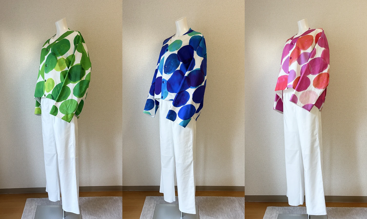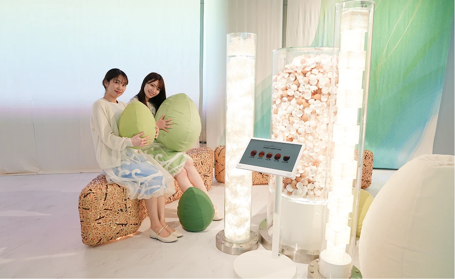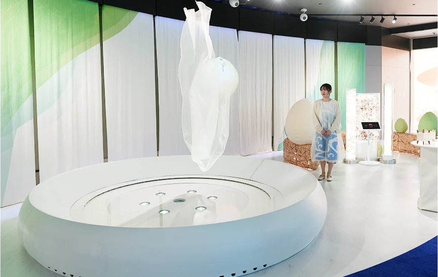 タマゴのシルエットをイメージし、京都の友禅作家・川邊祐之亮氏、ファッションデザイナー「divka」がそれぞれデザインを担当しました。ユニフォームの生地には、卵殻膜から生まれた生命の繊維「ovoveil」が使われています。